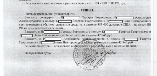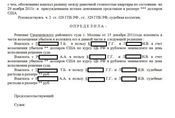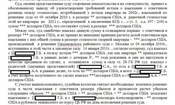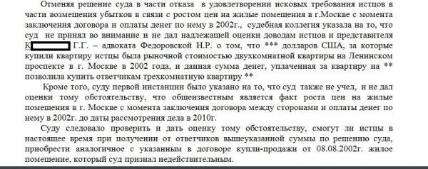14.01.2011 г. Московский городской суд г. Москвы решение Симоновского районного суда г. Москвы, в части признания недействительным договора купли-продажи квартиры от 08.08.2002 года, и взыскания с ответчиков полученные по сделке денежных средств в размере 56.000 долларов США и взыскания с ответчиков оплаченной истцами государственной пошлины в размере 20 000 рублей оставил без изменения, а кассационную жалобу ответчиков — без удовлетворения. В части отказа в удовлетворении требований по взысканию убытков решение Симоновского районного суда было отменено и дело в этой части направлено на новое рассмотрение.