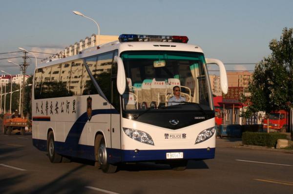 А это — китайский автозак. Все отличие от междугороднего автобуса — труба за сидениями, где пристегиваются наручники