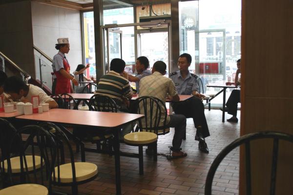 И вот пожалуйста — китайские полицейские с этапируемым в кафешке Mr.Lee у вокзала Харбина. Я б сам с удовольствием съел тамошнюю лапшу с говядиной