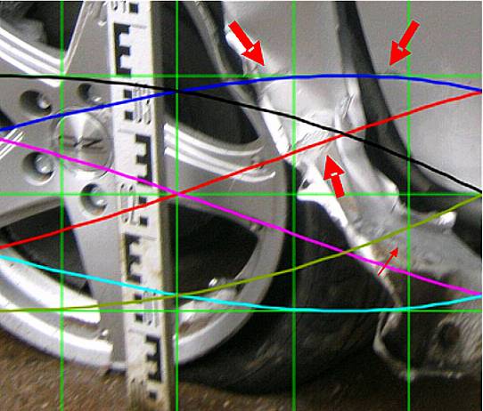 Читать надо внимательнее, уважаемый Владислав Александрович! Нижняя часть крыла выгнута наружу. Это хорошо видно из фотографии в заключении специалиста. Тогда, если разогнуть, один из ваших следов ложится на фиолетовую линию, а второй на светло-голубую.