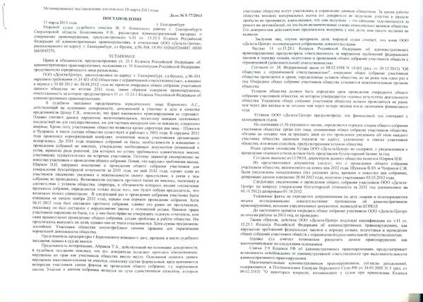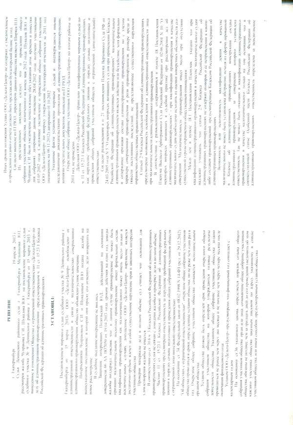 В ходе административного расследования Общество давало письменные и устные пояснения, из которых следует, что более поздний (6 ноября 2012 года) созыв общего собрания, от участия в котором потерпевшие уклонились, был вызван непредвиденными и непреодолимыми для Общества обстоятельствами, вспыхнувшим корпоративным конфликтом, стремлением потерпевшими любой ценой причинить вред Обществу и его директору.