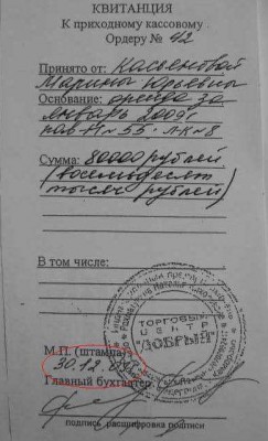 При подготовке дела к судебному разбирательству, ответчица – ИП Касьянова М.Ю. категорически возражала против удовлетворения исковых требований, кроме того представила, для приобщения к материалам дела, копии документов, подтверждающих якобы внесение арендных платежей (квитанций к приходно-кассовому ордеру) за спорный период, т.е. за период времени когда ответчица пользовалась торговым помещением за пределами срока действия договора аренды. Ознакомившись, в судебном заседании, с копией одной из квитанций, нами было установлено, что дата «документа» (30.12.2009 г., которая еще даже не наступила) не соответствует действительности, т.е. документ – ЯВНО СФАЛЬСИФИЦИРОВАН! Вот эта копия квитанции: