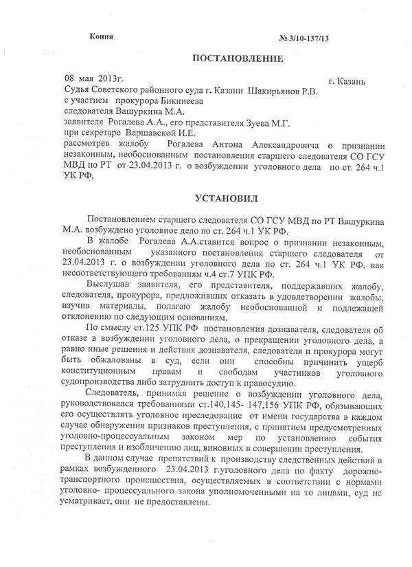 Отменить постановление Советского районного суда г. Казани от 8 мая 2013 года по делу № 3/10-137/13 и вынести новое решение, а именно: отменить постановление о возбуждении уголовного дела и принятии к своему производству от 23 апреля 2013 года в отношении Рогалева А.А. по признакам преступления предусмотренного частью 1 ст. 264 УК РФ вынесенное Старшим следователем СО ГСУ МВД РФ по Республике Татарстан Вашуркиным М.А. как незаконное, необоснованное, несоответствующее требованиям ч. 4 ст.7 УПК РФ.