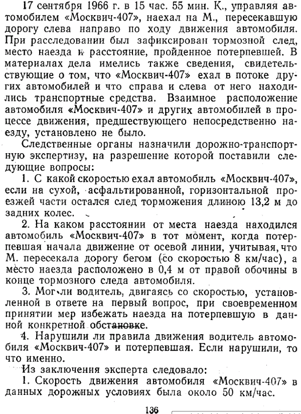 Если эксперт установил, что к моменту достижения автомобилем линии движения пешехода последний успевал выйти за пределы опасной зоны (даже когда водитель не принимал мер к снижению скорости) и, следовательно, не создавал помехи для движения автомобиля, следует сделать вывод об отсутствии причинной связи между действиями пешехода и возникновением происшествия. Причиной происшествия, с технической точки зрения, в данном случае явились действия водителя, который неоправданным маневром создал аварийную обстановку.