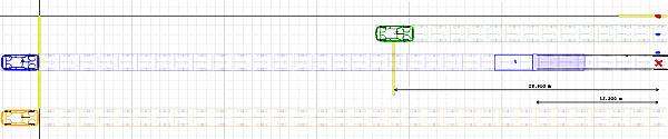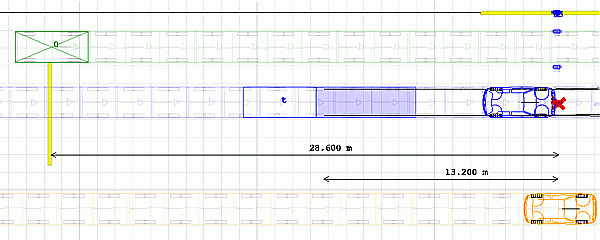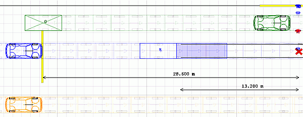 На рисунке показано исходное состояние, момент 0. Синим – ваш автомобиль, оранжевым – контрольный (как ваш, но он не будет тормозить), зеленым – другой, заслоняющий, например, видимость пешехода, красное пятно справа – пешеход. Скорость синего и оранжевого 60км/ч, скорость пешехода 4.4 км/ч.