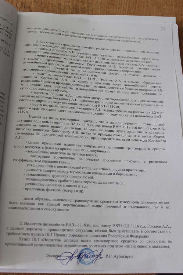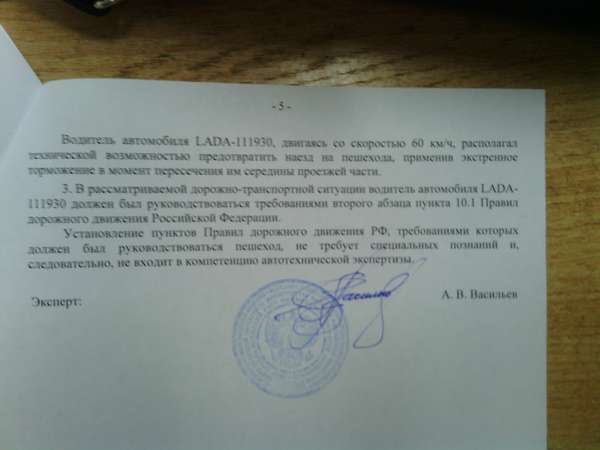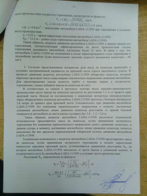 Эксперт установил, что моментом возникновения опасности является выход пешехода на полосу встречного движения. При этом автомобиль находился на удалении 67м, его остановочный путь был 38м, а, значит, водитель мог остановиться. При этом первоначально автомобиль двигался правым бортом на расстоянии 3.8 м (откуда и как?) от правого края проезжей части, а наезд произошел на расстоянии от нее 1.2 м.