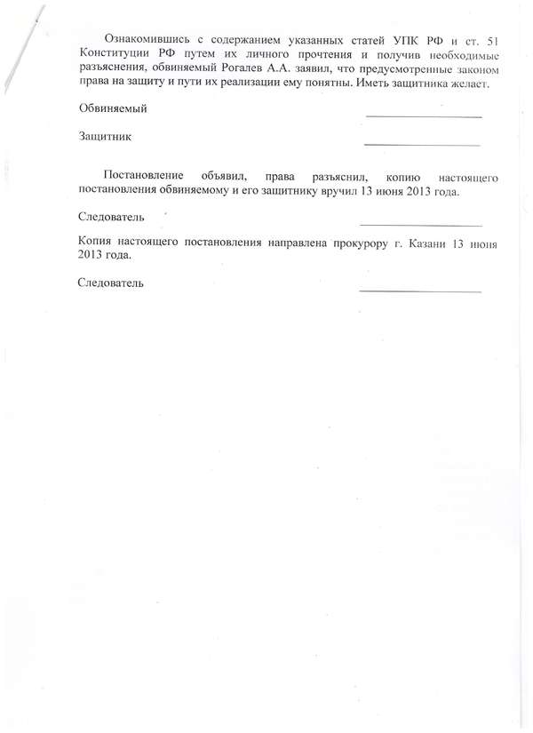 1) Постановление о возбуждении уголовного дела и принятии к своему производству от 23 апреля 2013 года в отношении Рогалева А.А. по признакам преступления предусмотренного частью 1 ст. 264 УК РФ вынесенное Старшим следователем СО ГСУ МВД РФ по Республике Татарстан Вашуркиным М.А.