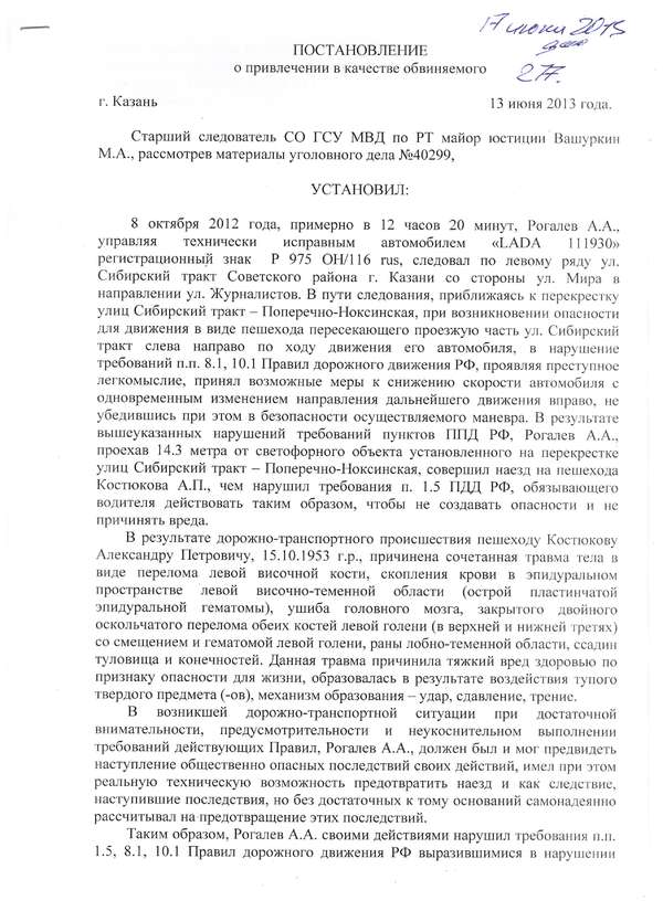 В 8 часов 00 минут 23 апреля 2013 года в отношении Рогалева А.А. по признакам преступления предусмотренного частью 1 ст. 264 УК РФ Старшим следователем СО ГСУ МВД РФ по Республике Татарстан Вашуркиным М.А. было вынесено постановление о возбуждении уголовного дела и принятии к своему производству. Указанному делу был присвоен № 40299.
