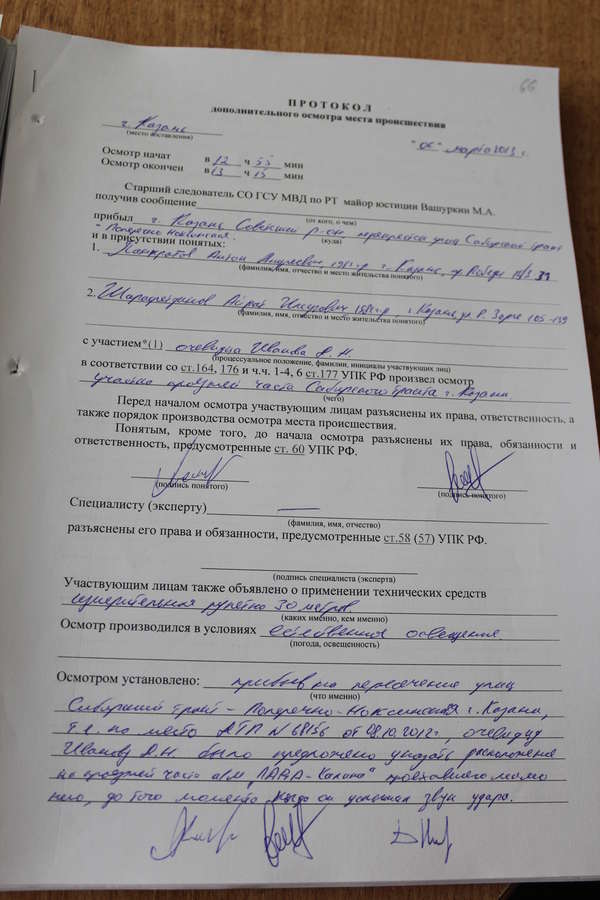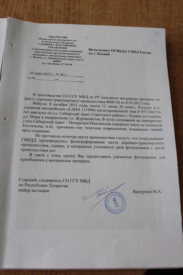 Однако в 8 часов 00 минут 23 апреля 2013 года в отношении моего доверителя по признакам преступления предусмотренного частью 1 ст. 264 УК РФ Старшим следователем СО ГСУ МВД РФ по Республике Татарстан Вашуркиным М.А. было вынесено постановление о возбуждении уголовного дела и принятии к своему производству. Указанному делу был присвоен № 40299.