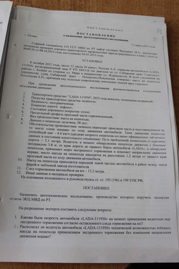 Считаю данное постановление о возбуждении уголовного дела немотивированным, необоснованным и в связи с этим незаконным по следующим основаниям: Согласно Постановлению ПЛЕНУМА ВЕРХОВНОГО СУДА РОССИЙСКОЙ ФЕДЕРАЦИИ от 9 декабря 2008 г. N 25 «О СУДЕБНОЙ ПРАКТИКЕ ПО ДЕЛАМ О ПРЕСТУПЛЕНИЯХ, СВЯЗАННЫХ С НАРУШЕНИЕМ ПРАВИЛ ДОРОЖНОГО ДВИЖЕНИЯ И ЭКСПЛУАТАЦИИ ТРАНСПОРТНЫХ СРЕДСТВ, А ТАКЖЕ С ИХ НЕПРАВОМЕРНЫМ ЗАВЛАДЕНИЕМ БЕЗ ЦЕЛИ ХИЩЕНИЯ (в ред.Постановления Пленума Верховного Суда РФ от 23.12.2010 N 31)» при рассмотрении дел о преступлениях, предусмотренных статьей 264 УК РФ, следует указывать нарушение каких конкретно пунктов Правил дорожного движения или правил эксплуатации транспортного средства повлекло наступление последствий, указанных в статье 264 УК РФ, и в чем конкретно выразилось это нарушение.