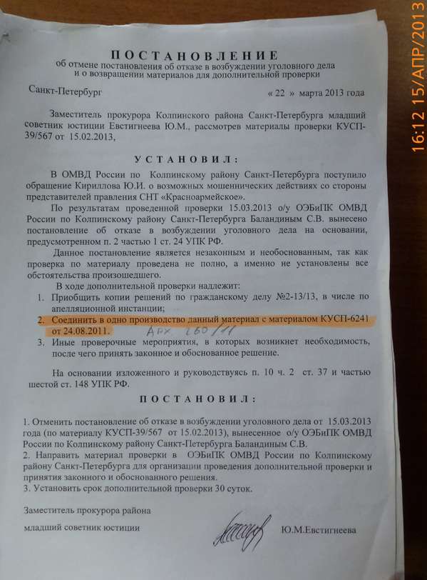 Вот узнав об этом она 15.02.2013 года обратилась в 39 ОП Колпинского ОМВД,