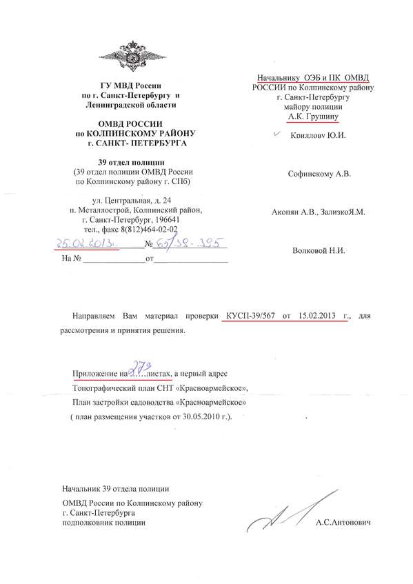 оповестили её письмецом, что отправили в ОЭБ и ПК ОМВД Колпино.