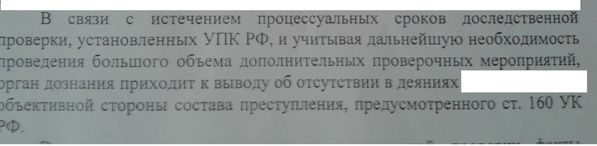 Тут вы не правы. УПК и УК у всех правоохранителей Российской Федерации одинаковый:):). Только виденье у них данных книжек разные, преимущественно в сторону более «интересной стороны». Вот у нас в Уфе я столкнулся с такой формулировкой оперуполномоченного ОЭБ и ПК при отказе в возбуждении уголовного дела по ст. 160 УК РФ:
