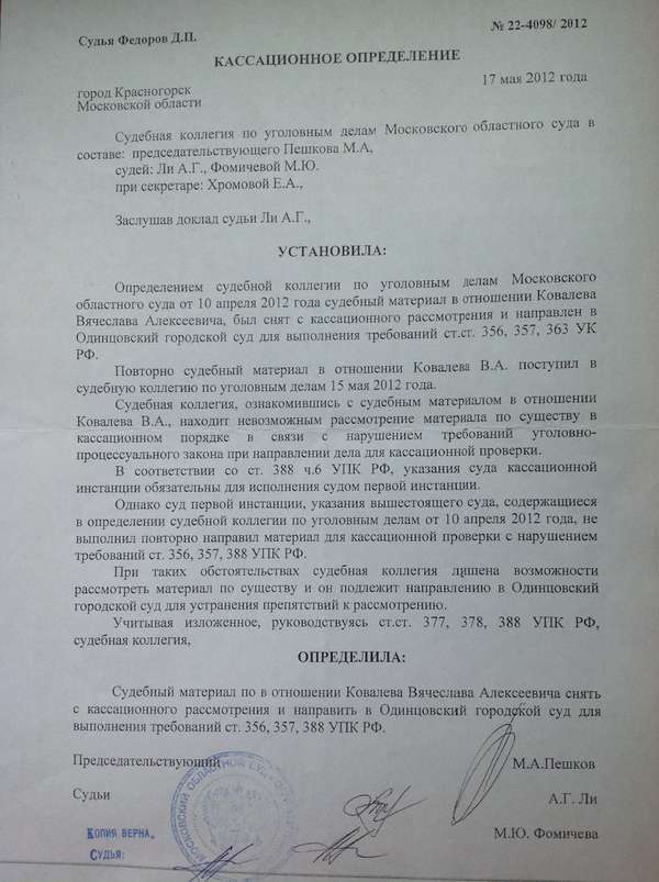 Уважаемый Сергей Александрович, коллеги! Ничего удивительного,-кадры… Вспомнилось дело в Лесном. Приговорили с моим подзащитным еще 2-х подельников к 2 г. лишения свободы условно. Мой был под подпиской о не выезде, а те 2-е под стражей. Я с подзащитным уехали домой, а тех оставили под стражей до окончания срока на подачу кассационной жалобы!!! Данное решение судьи было отражено и в приговоре. У нас таких ляпсусов не делают, так своевольничают в основном по мелочам. Уровень судей высок, надо отдать должное.Известен случай когда судья выдал решение на право собственности на чужую квартиру -просто тех ошибка,- описался.