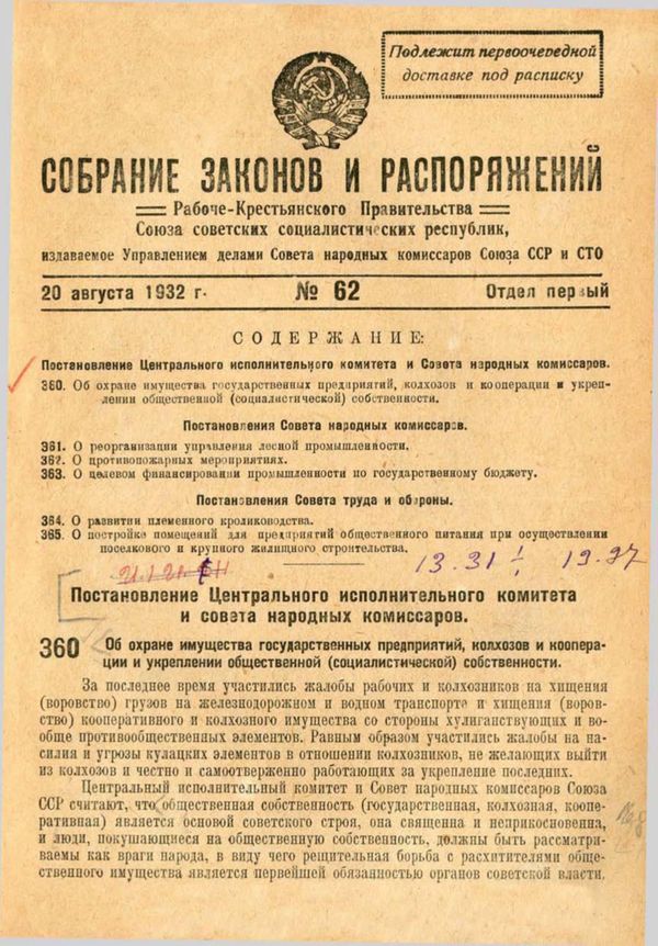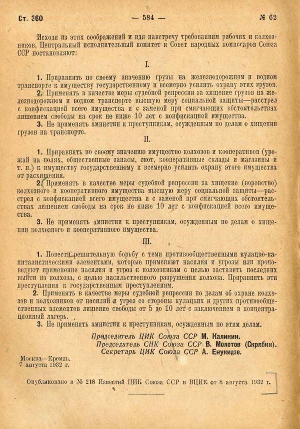Итак экскурс в историю, в «Закон о трёх колосках» (также закон «семь восьмых», «закон от седьмого-восьмого», «закон о пяти колосках», указ «7-8») — это в «простонародии» одно и то же что и Постановление ЦИК и СНК СССР от 7 августа 1932 года «Об охране имущества государственных предприятий, колхозов и кооперации и укреплении общественной (социалистической) собственности».
