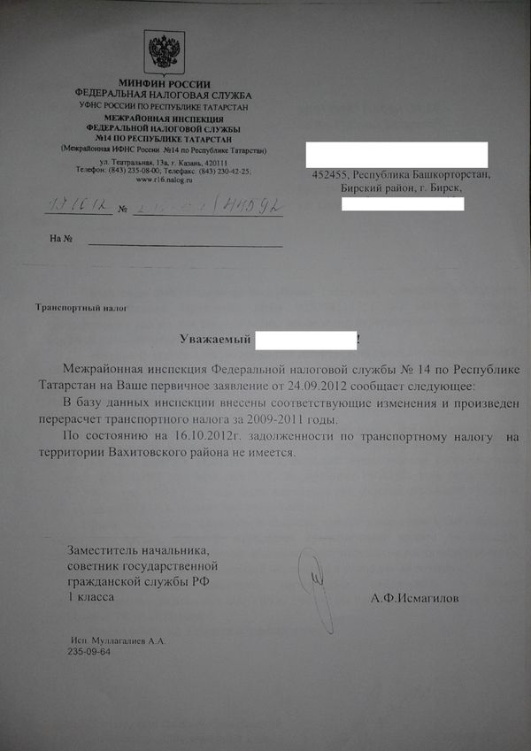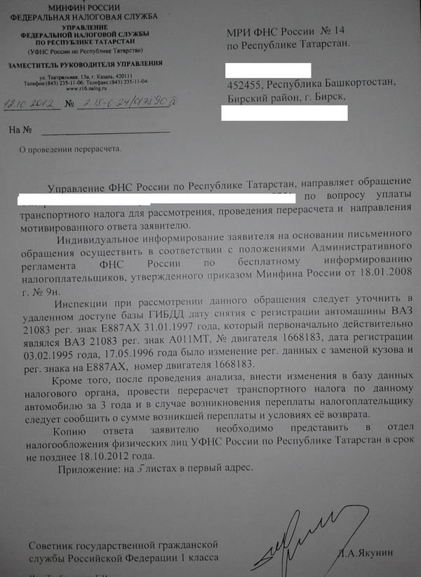 Каким – то образом он раздобыл справку — счет на кузов автомашины, который он менял в бытность хозяина ВАЗ 21083, где был обнаружен номер заменяемого кузова. На основании новых сведений я подготовил мотивированное письмо одновременно в адрес ИФНС Республики Татарстан и Министру внутренних дел Республики Татарстан с просьбой внести соответствующие изменения в имеющиеся базы данных.