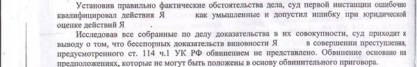 В целом не приведя никаких существенных доводов, так и не представив каких-либо доказательств владения навыками защиты и нападения моим подзащитным, сторона обвинения осталась при своем, а судебная коллегия в свою очередь оставила без изменения оправдательный приговор суда апелляционной инстанции.