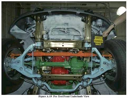 Как видно, что так и есть – автомобиль испытывался на удар левой передней частью, а не существенно менее жесткой боковой поверхностью. Для полноты приведем еще две фотографии из указанного документа – вид на переднюю часть снизу.
