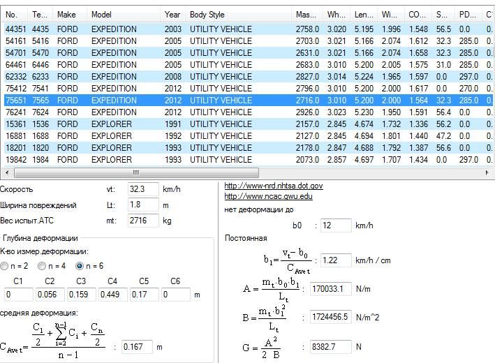 Любопытный читатель может скачать краш-тест №7565 на боковой удар в столб Ford Expedition, а я замечу, что коэффициенты жесткости бока у него А=170033.1 н/м, В=1724456.5 н/м2, G=8382.7.8 н, а не вдвое большие А=374184.6 н/м, В=3287826.6 н/м2, G=21292.8 н, каковыми пользовал защиту и следствие специалист Муйземнек А.Ю.