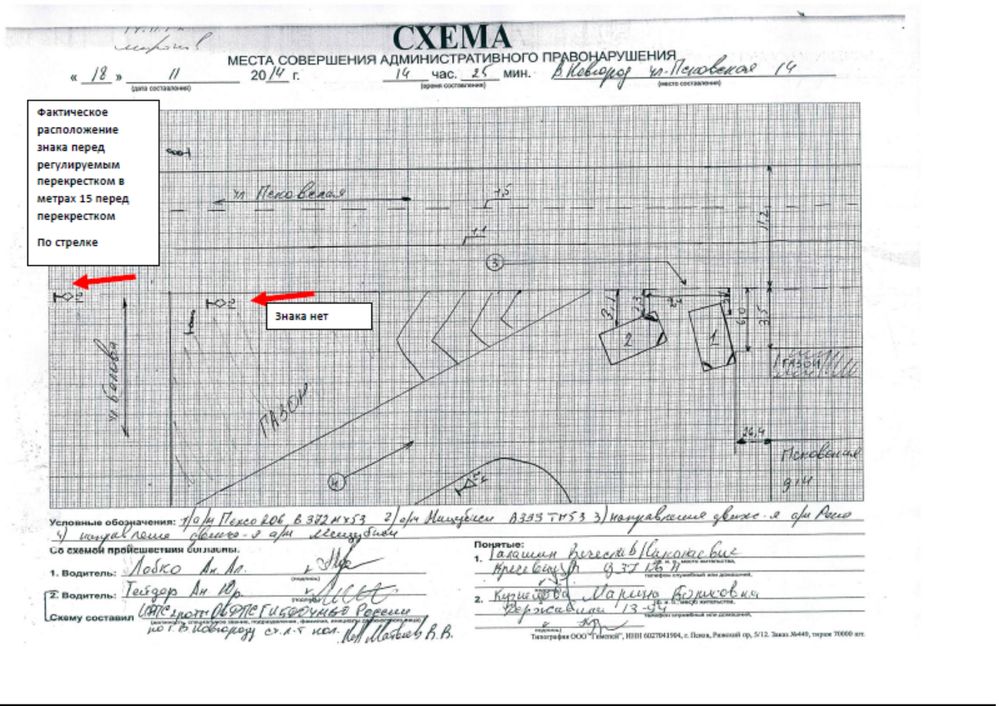 Я не увидел все-таки информации по дислокации дорожных знаков и разметки (проект, паспорт, дислокация — этот документ! по разному может называться) (может не внимательно читал), однако у меня есть ощущение что у для вашего оппонента стоял знак «только прямо».