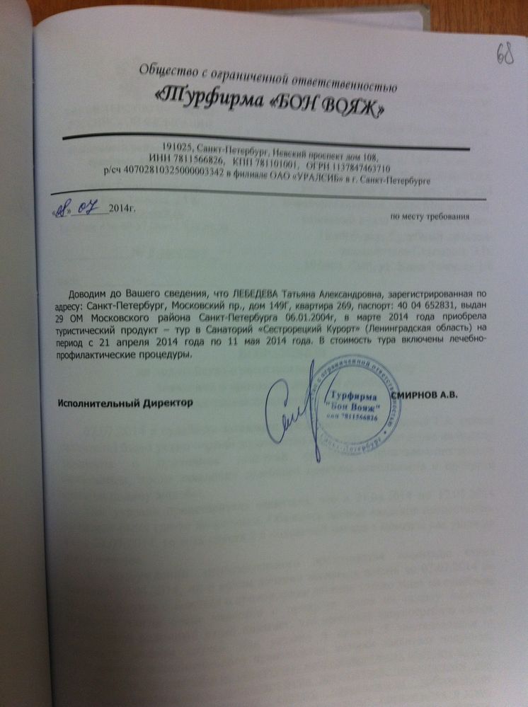 Судья назначила рассмотрение сразу 2-х заявлений сначала по восстановлению срока, а затем по расходам. (Моя часть была в восстановлении срока, представителя управления в расходах). Однако я решила не бездействовать по этому делу и сфотографировав в деле справку что принесла адвокат решила посмотреть что это за турфирма. И каково было моё удивление, что на сайте данной турфирмы чёрным по белому было указано, что они специализируются в организации поездок по загранице, а в справке значится, что Лебедева отдыхала в санатории в Лен. области.