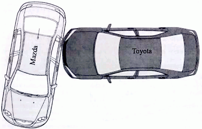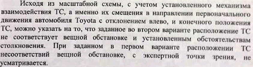 Тойота мытарей своей передней частью оставила на левой задней двери Мазды четкий отпечаток части госномера, поэтому эксперт решил, что в момент столкновения взаимное положение автомобилей было таким. Ну и пусть.