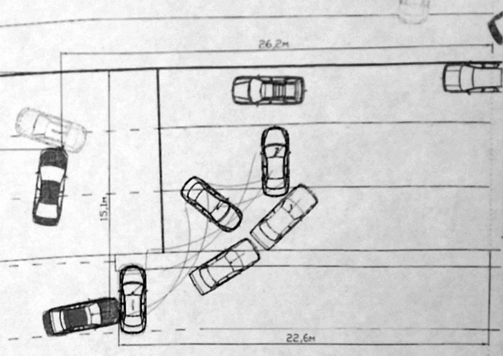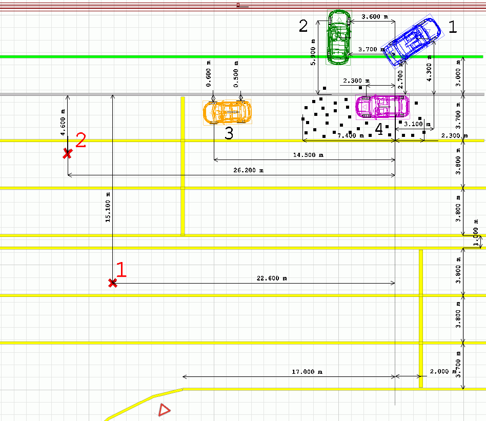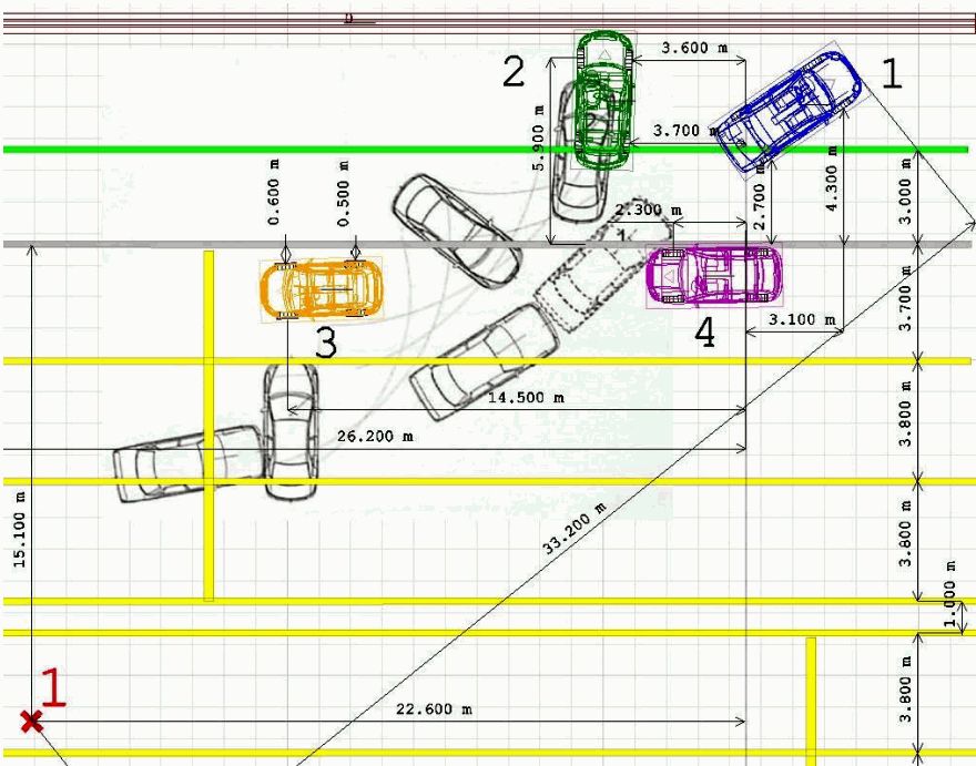 После того, как оба автомобиля, Тойота (на рисунке ниже – №1) и Мазда (на рисунке ниже – №2) проскочив между припаркованными еще двумя №3 и №4, остановились, место ДТП выглядело так, как на масштабной схеме ниже. Никаких следов шин на мокрой дороге не осталось, только россыпь осколков около припаркованной машины №4.
