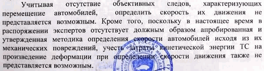 Ну ладно, проехали. Что-то мелькнуло в голове эксперта Горчакова, и дальше, в начале стр.14, он написал, что «можно сделать вывод о том, что при имеющемся в распоряжении эксперта объеме исходных данных установить расположение ТС относительно границ проезжей части на момент первоначального контакта и, соответственно, координаты места столкновения, а также скорости движения ТС не представляется возможным». Тут бы и закончить, но что же еще на оставшихся 23-13=10 листах текста? Читаем …