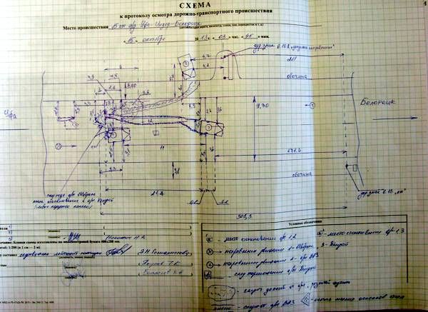 Исследовав место ДТП, в том числе – с фонарем (как на последнем фото в руках подполковника), кармаскалинские сыщики, наряду с протоколом осмотра, произвели творение, называемое по казенному схемой ДТП. Эта схема показана на рисунке ниже и более крупно – в приложении.