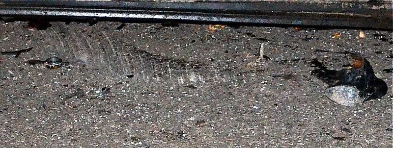 Такой след образуется при скольжении не заблокированного (полностью) колеса в направлении, не совпадающем с направлением плоскости колеса. Его переменная ширина свидетельствует об изменении вертикальной нагрузки на колесо во время образования следа. То есть это – след, образованный во время удара одним из передних колес либо ВАЗа либо Шевроле. Этого «слона» ни пинкертоны, ни эксперт Азат не заметили.
