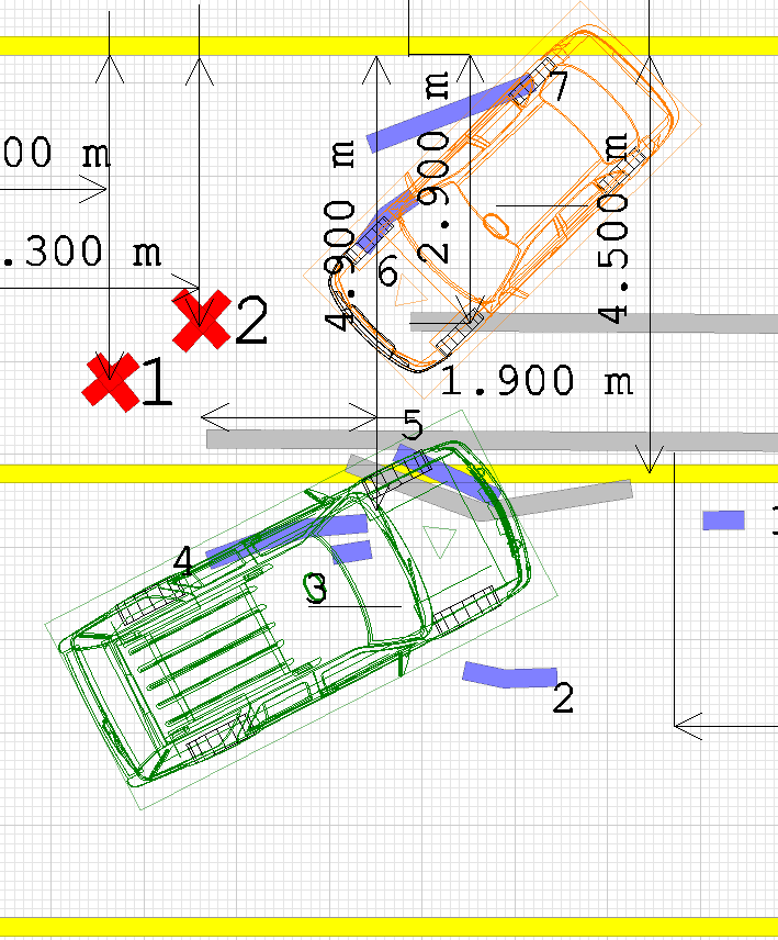 В суде он запросто, не моргнув глазом, определял по фотографиям, не сходя с места, все что угодно, вплоть до направления скольжения колес по следам, углы, … Я заявил, что он врет, так как иначе бы привез свой масштабный чертеж типа последнего рисунка выше, откуда бы следовало, что след №2 оставлен правым передним колесом Шевроле. А на нет – суда нет, одна говорильня при фактически убогой экспертизе.