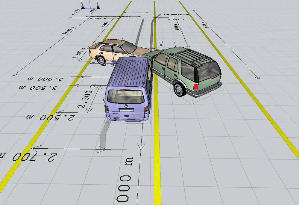 Начинаем двигать модель Шевроле из положения в момент второго столкновения, показанный на первом рисунке это статьи, в его конечное положение так, чтобы переднее левое колесо Шевроле не отрывалось от его зафиксированного в схеме следа.