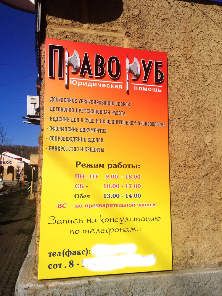 2. ИП, оказывающий юридические услуги, с «оригинальной» вывеской (ниже на фото).