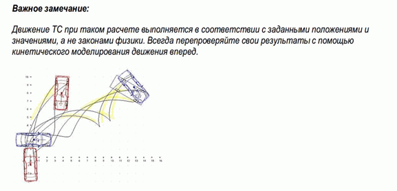 Из рисунка видно, что такое движение явно не соответствует законам физики. Но PC-Crash сосчитает и это – воля эксперта превыше всего. Можно поставить два или три и более автомобиля, и для каждого из них снова проделать это же. Картинка красивая, но там нет ударов между автомобилями, и картинка, или ее анимация – это только визуализация видения эксперта. Так в Руководстве по PC-Crash и написано: