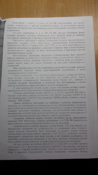 Охранник автостоянки пояснил, что за два дня до прихода моего доверителя за своим автомобилем, одно из рядом стоящих авто в ночное время самопроизвольно воспламенилось, и огонь перекинулся на два рядом стоящих автомобиля, в том числе и на автомобиль моего доверителя. Сотрудники автостоянки не успели (или просто не захотели) предпринять оперативных мер по тушению горевших автомобилей, и вызвали пожарную охрану только лишь спустя 30-ти минут с момента возгорания. В результате данного пожара, был причинен значительный материальный ущерб собственникам двух транспортных средств, одно из которых имело стоимость свыше одного миллиона рублей.