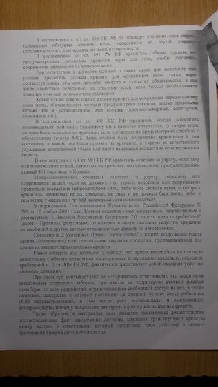 Правовая позиция истца была основана на следующих нормах ГК РФ: ст. 309 ГК РФ, п.1 ст. 886 ГК РФ, п.1 ст. 401 ГК РФ, а также: Постановление Пленума ВС РФ № 17 от 28.06.2012г. «О рассмотрении судами гражданских дел по спорам о защите прав потребителей», «Правила оказания услуг автостоянок» от 17.11.2001г. №795.