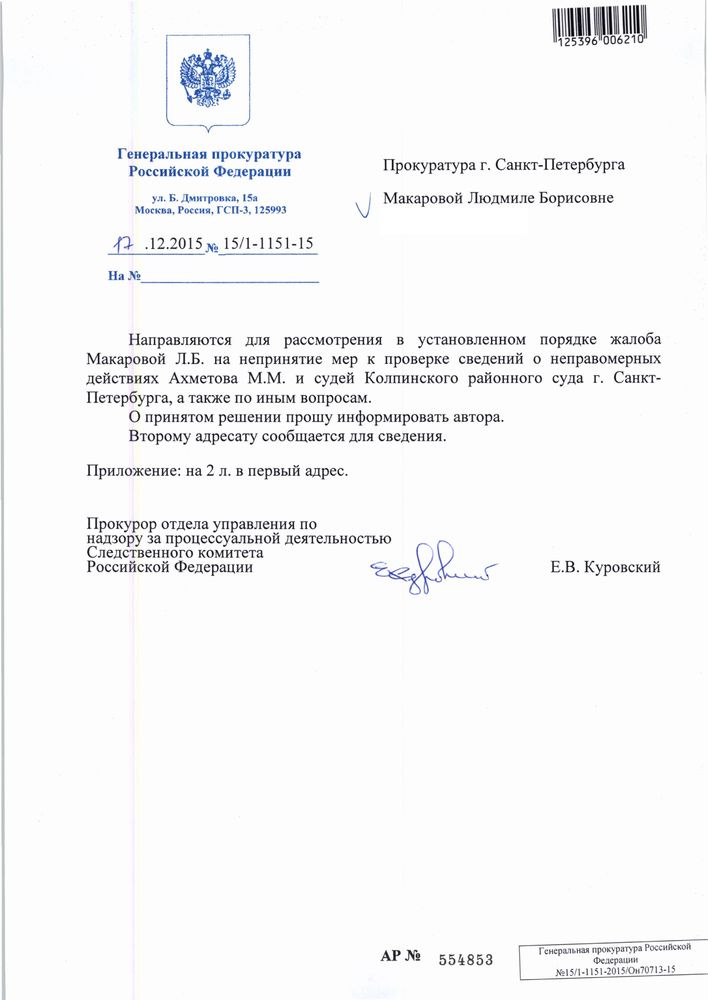 Все эти деяния (преступления ст. ст. 170.1 УК РФ, ст. 285.3 УК РФ, ст. 170.2 УК РФ, ст. 285 УК РФ, ст. 286 УК РФ, ст. 294 УК РФ, ст. 303 УК РФ, ст. 315 УК РФ) совершены и окончены в 2011 и в 2012 года под прикрытием прокуроров Колпино, полиции Колпино и Колпинского СО ГСУ СК РФ по СПб, с 2014 года, всё взяла под свою крышу генерал-майор юстиции Парастаева Марина Григорьевна… На сегодня это крышуется и на уровне СК РФ ГУПК в Москве...