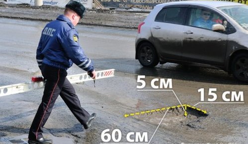 Прибывшие на место сотрудники ГИБДД, произвели замеры ямы, по результатам которых, длина выбоины составила 150 см., ширина 40 см. и глубина 20 см., что не соответствует предельным размерам отдельных просадок, выбоин, которые не должны превышать по длине 15 см, ширине — 60 см и глубине — 5 см (пункт 3.1.2 ГОСТа Р 50597-93).