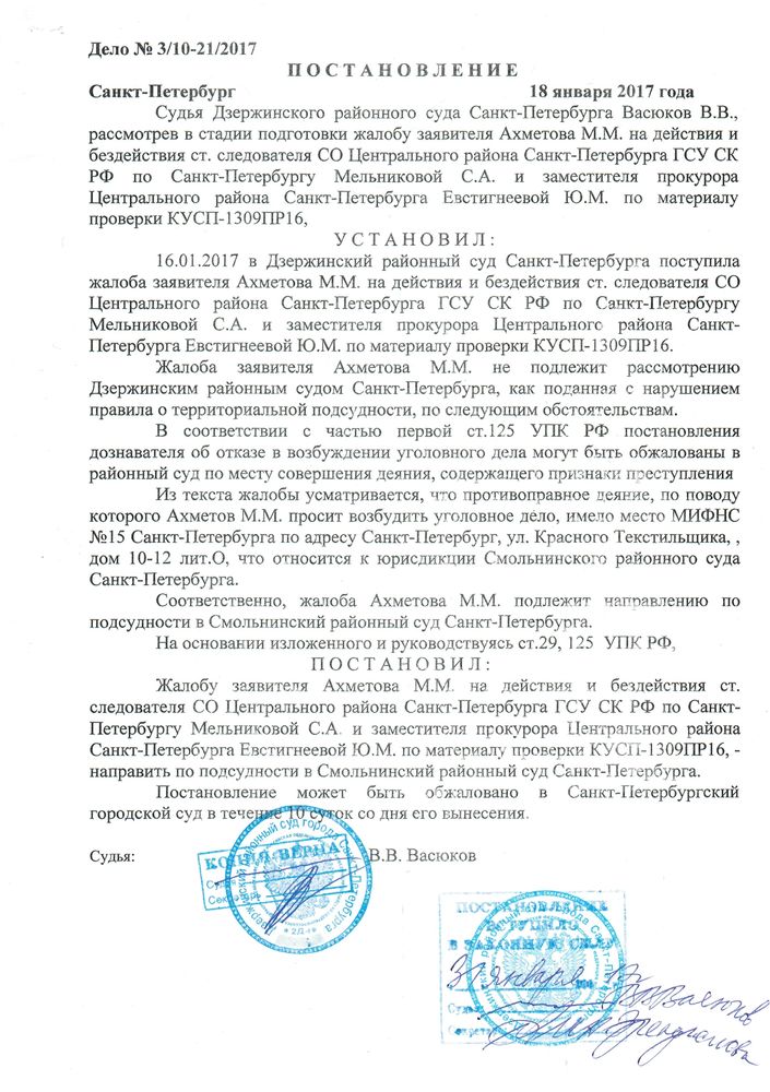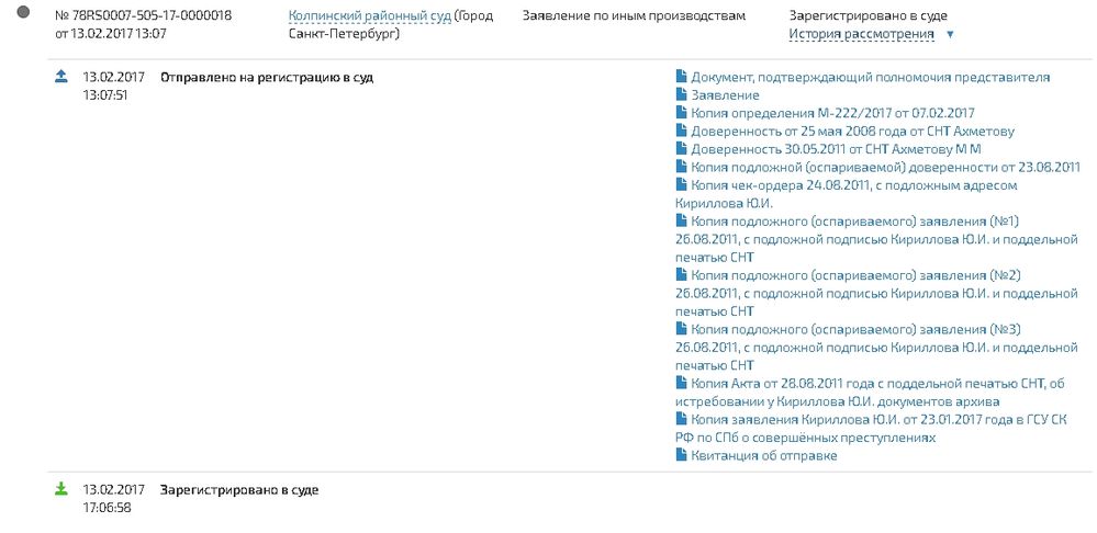 Гражданин с правами лица имеющего право действовать без доверенности, законно избранный председатель правления подаёт заявление в суд, о признании решений ничтожными. Суд по ходатайству от 07.12.2012 года, направляет Запрос в МИФНС № 15 по СПб, однако должностное лицо совершившее должностное преступление в период с 23.08.2011 года по 12.09.2011 года, умышленно предоставляет в суд недостоверные сведения. Предоставляет документы, укрыв данные в указанный период.