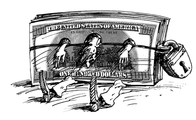 А колония обычно либо «занимает деньги» у колониальной администрации в виде ЦБ, которая печатает денег ровно столько, сколько нужно под вывозимый ресурс (поэтому «денег нет и не будет»), либо ищет иностранных инвесторов, которые никогда не будут ничего делать в интересах местного населения, т.к. целеполагание иностранного инвестора иное, чем у суверенного государства, обеспечивающего собственную экономику собственным платёжным средством.
