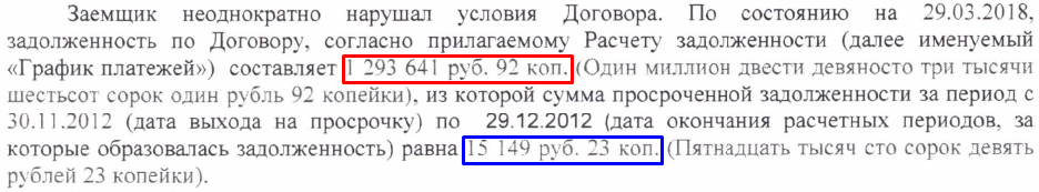 Особое внимание стоит обратить на сам иск ПАО НБ «ТРАСТ» за подписью представителя банка А.С. Зайцевой. Итак… в иске черным по белому указано о том, что заемщик (мой доверитель) неоднократно нарушал условия договора, в итоге по состоянию на 29.03.2018 года задолженность по договору составила — 1 293 641 руб. 92 коп. Приводится расчет данной задолженности, который мне так и не стал понятным, однако банк не просил суд взыскивать именно данную сумму задолженности, а просил взыскать лишь задолженность в сумме 15 149 руб. 23 коп., образовавшуюся за период с 30.11.2012 года по 29.12.2012 года. Представитель Зайцева, а кто остальную сумму взыскивать будет ????