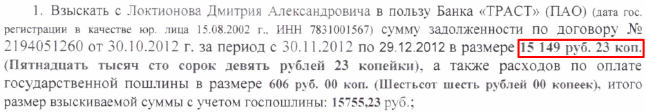 В марте 2018 года Мировым судьей судебного участка № 1 Центрального судебного района г.Прокопьевска в отношении моего будущего доверителя был вынесен судебный приказ, в соответствии с которым Мировой судья решила взыскать с доверителя в пользу ПАО НБ «ТРАСТ» задолженность по договору от 30.10.2012 года в сумме 15 149 рублей 23 коп.