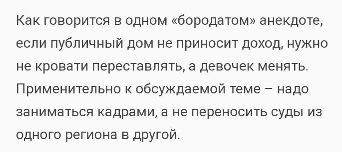 Уважаемый Николай Николаевич, поскольку я уже достаточно давно живу на этом свете и достаточно много успел повидать, я как-то не слишком верю в успешность судебных реформ, выражающихся в строительстве новых судов и создании новых судебных инстанций, при неизменном подходе к кадровым вопросам.