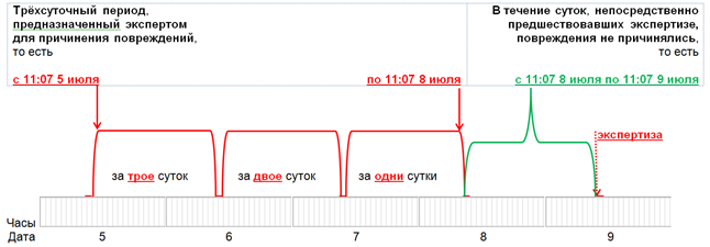Уловили смысловую разницу между «за 1-3 суток до» и «в течение трёх последних суток до»? «Отмотаем» одни сутки назад от начала проведенной экспертизы и пометим их как зелёную зону, в которой повреждения не причинялись.
