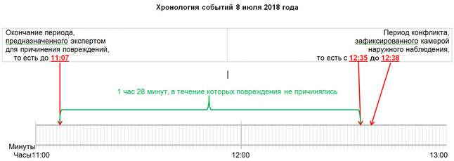 Получилось, что 8 июля временной интервал, отведенный экспертом для причинения повреждений, закончился в 11:07, а конфликт начался в 12:35, то есть через 1 час 28 минут после этого.