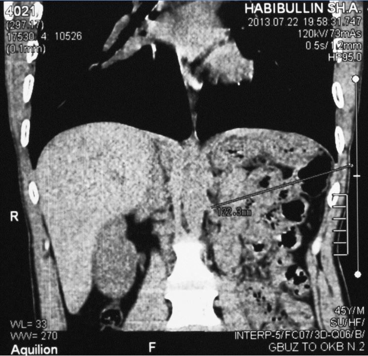Раневой канал закончился в левой почке на уровне «сосудистой ножки». Повреждение почечной артерии сопровождалось кровотечением, которое не удалось остановить ушиванием, и поэтому почка была удалена. За дно раневого канала принята оставшаяся после удаления почки культя почечной артерии.