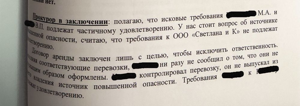 Из всех материалов для обоснования позиции был спорный договор аренды, страховой полис на фуру и протоколы допросов Семена по уголовному делу. В которых он изначально говорил о работе на Владимира, но потом, уточнив свои показания, заявил об ошибочности своих ранее данных слов и «вспомнил» про договор аренды.