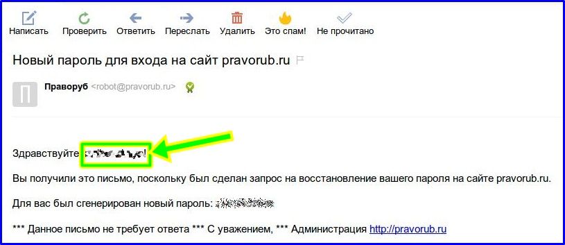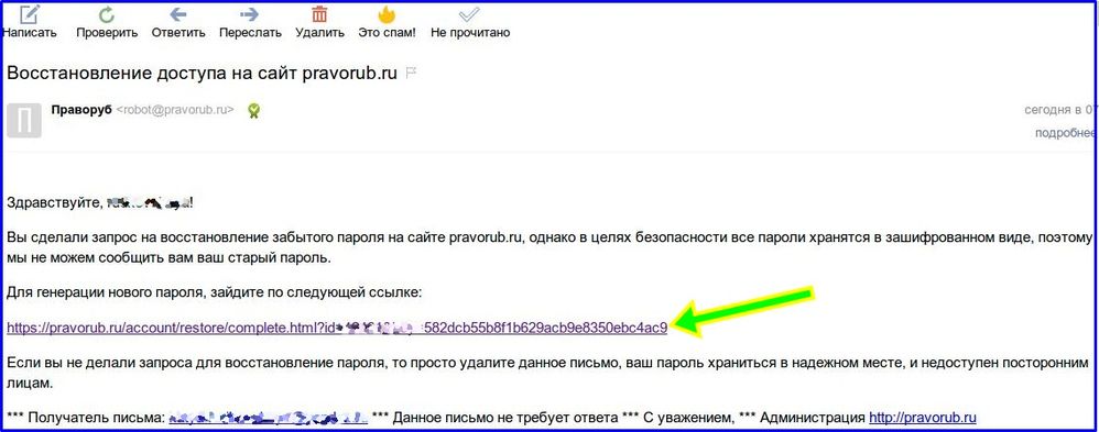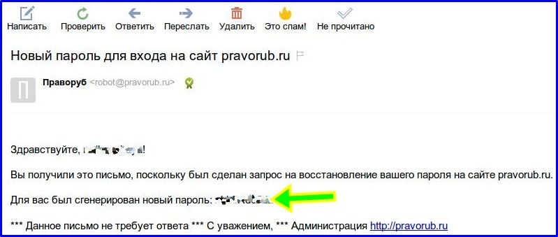 Эта промежуточная ссылка нужна для того, чтобы система безопасности сайта убедилась в том, что это именно с того самого электронного адреса, который был указан при регистрации на Праворубе, поступает запрос на смену пароля. 3) Опять заходите на свою электронную почту, теперь там вас ждет пароль с Праворуба: