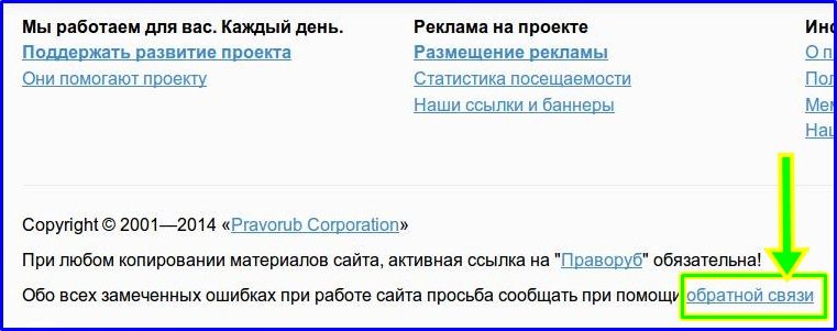 5) Если ситуация еще более запущенная — вы забыли с какого электронного ящика вы регистрировались, а попасть на Праворуб очень хочется (что очень похвально!) и тут есть выход — обращение в службу техподдержки.Идите в самый низ любой страницы Праворуба и жмите на «Обратной связи»: