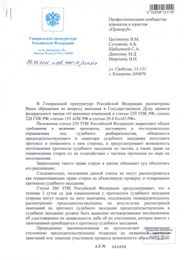 Сегодня в адрес адвокатов НО «КА» Цитадель» № 127 КО Морохина И.Н., Шабалиной С.А., Данилина М.Д., Цыганкова В.М., Суховеева А.Б. поступил ответ на заявленный проект ФЗ РФ «О внесении изменений в ст. 259 УПК РФ, ст. 228 ГПК РФ, ст. 155 АП РФ, и ст. 29.8 КоАП РФ» следующего содержания: